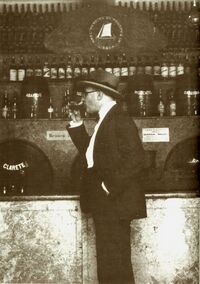 Pessoa adopted the detached perspective of the flâneur Bernardo Soares, one of his heteronyms.[21] This character was supposedly an accountant, working for Vasques, the boss of an office located in Douradores Street. Soares also supposedly lived in the same downtown street, a world that Pessoa knew quite well due to his long career as freelance correspondence translator. Indeed, from 1907 until his death in 1935, Pessoa worked in twenty-one firms located in Lisbon's downtown, sometimes in two or three of them simultaneously.[22] In The Book of Disquiet, Bernardo Soares describes some of these typical places and describes one's "atmosphere". In his daydream soliloquy he also wrote about Lisbon in the first half of the 20th century. Soares describes crowds in the streets, buildings, shops, traffic, the river Tagus, the weather, and even its author, Fernando Pessoa: