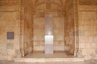 In his lifetime, he published four books in English and one alone in Portuguese: Mensagem (Message). However, he left a lifetime of unpublished, unfinished or just sketchy work in a domed, wooden trunk (25,574[66] manuscript and typed pages which have been housed in the Portuguese National Library since 1988). The heavy burden of editing this huge work is still in progress. In 1985 (fifty years after his death), Pessoa's remains were moved to the Hieronymites Monastery, in Lisbon, where Vasco da Gama, Luís de Camões, and Alexandre Herculano are also buried.[67] Pessoa's portrait was on the 100-escudo banknote.