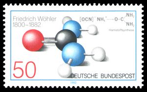 On the 100th anniversary of Wöhler's death, the West German government issued a stamp depicting the structure of urea with its synthesis formula listed directly below.[39]