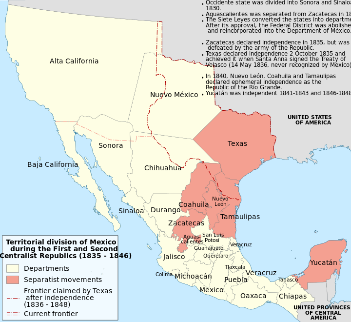 خريطة المكسيك، 1835–1846، مع توضيح للحركات الانفصالية