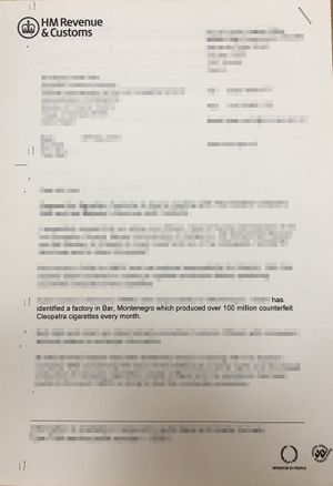 في مراسلات سرية من عام 2015، وصفت HMRC مصنعاً لم يذكر اسمه في الجبل الأسود بأنه ينتج "100 مليون سيجارة كليوپاترا مزيفة شهرياً". وحددت لاحقاً مصنع پودگوريتسا للتبغ كمصدر للسجائر "التي يعتقد أنها مزيفة.