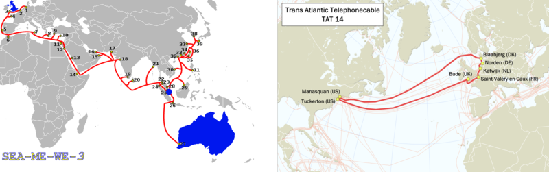 Left: SEA-ME-WE 3, which runs across the Afro-Eurasian supercontinent from Japan to Northern Germany, is one of the most important submarine cables accessed by the "Five Eyes". Singapore, a former British colony in the Asia-Pacific region (blue dot), plays a vital role in intercepting internet and telecommunications traffic heading from Australia/Japan to Europe, and vice versa. An intelligence sharing agreement between Singapore and Australia allows the rest of the "Five Eyes" to gain access to SEA-ME-WE 3.[100]