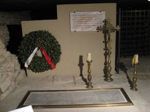 Brunelleschi's body lies in the crypt of the Cathedral of Florence. Antonio Manetti, who knew Brunelleschi and wrote his biography that Brunelleschi "was granted such honours as to be buried in the Basilica di Santa Maria del Fiore, and with a marble bust, which was said to be carved from life, and placed there in perpetual memory with such a splendid epitaph."[22] Inside the cathedral entrance is this epitaph: "Both the magnificent dome of this famous church and many other devices invented by Filippo the architect, bear witness to his superb skills. Therefore, in tribute to his exceptional talents, a grateful country that will always remember him buries him here in the soil below." A statue of Brunelleschi, looking up at his dome, was later placed in the square in front of the cathedral.