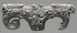 The earliest Anglo-Saxon coin type, the silver sceat, forced craftsmen, no doubt asked to copy Roman and contemporary continental styles, to work outside their traditional forms and conventions in respect of the heads on the obverse, with results that are varied and often compelling. Later silver pennies, with largely linear relief heads of kings in profile on the obverse, are more uniform, as representatives of what was a stable and respected currency by contemporary European standards.[27] A number of complete seax knives have survived with inscriptions and some decoration, and sword fittings and other military pieces are an important form of jewellery. A treatise on social status needed to say that mere ownership of a gilded sword did not make a man a ceorle, the lowest rank of free men.[28]
