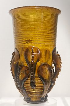 Anglo-Saxon glass was mostly made in simple forms, with vessels always in a single colour, either clear, green or brown, but some fancy claw beakers decorated with large "claw" forms have survived, mostly broken; these forms are also found in northern continental Europe. Beads, common in early female burials, and some ecclesiastical window glass was more brightly coloured, and several monastic sites have evidence of glass production. Vessel and bead production probably continued, at a much lower level, from the Romano-British industry, but Bede records that Benedict Biscop brought glass-makers from Gaul for window glass at his monasteries. It is not clear how much Anglo-Saxon glass was imported, but canes of millefiori coloured glass almost certainly were; one of these was in the purse at Sutton Hoo. Otherwise recycling of Roman glass may have avoided the need to import raw glass; evidence for the production of this is slender. Glass is sometimes used as a substitute for garnet in jewellery, as in some pieces from Sutton Hoo. Enamel was used, most famously in the Alfred Jewel, where the image sits under carved rock crystal, both materials are extremely rare in surviving Anglo-Saxon work.