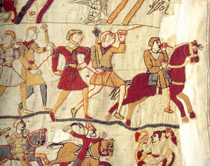 The Bayeux Tapestry is embroidered in wool on linen and shows the story of the Norman conquest of England; it is surely the best known Anglo-Saxon work of art, and though made after the Conquest was both made in England and firmly in an Anglo-Saxon tradition, points now accepted by French art-historians.[45] Such tapestries adorned both churches and wealthy houses in England, though at 0.5 by 68.38 metres (1.6 by 224.3 ft, and apparently incomplete) the Bayeux Tapestry must be exceptionally large. Only the figures and decoration are embroidered, on a background left plain, which shows the subject very clearly and was necessary to cover very large areas. All kinds of textile arts were produced by women, both nuns and laywomen, but many were probably designed by artists in other media. Byzantine silks were available, though certainly expensive, in Anglo-Saxon England, and a number of pieces have been found used in burials and reliquaries. Probably, as in later vestments, these were often married with locally embroidered borders and panels. If we had more Anglo-Saxon survivals, Byzantine influences would no doubt be apparent.[46]