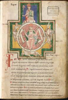 Fortuna did not disappear from the popular imagination with the ascendancy of Christianity.[21] Saint Augustine took a stand against her continuing presence, in the City of God: "How, therefore, is she good, who without discernment comes to both the good and to the bad?...It profits one nothing to worship her if she is truly fortune... let the bad worship her...this supposed deity".[22] In the 6th century, the Consolation of Philosophy, by statesman and philosopher Boethius, written while he faced execution, reflected the Christian theology of casus, that the apparently random and often ruinous turns of Fortune's Wheel are in fact both inevitable and providential, that even the most coincidental events are part of God's hidden plan which one should not resist or try to change. Fortuna, then, was a servant of God,[23][24] and events, individual decisions, the influence of the stars were all merely vehicles of Divine Will. In succeeding generations Boethius' Consolation was required reading for scholars and students. Fortune crept back into popular acceptance, with a new iconographic trait, "two-faced Fortune", Fortuna bifrons; such depictions continue into the 15th century.[25]