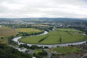 احدى ثنيات النهر، كما تبدو من Wallace Monument. ينساب النهر من اليمين إلى اليسار، and the former limit of navigation was in the left distance.