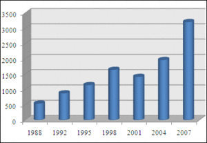 Main foreign exchange market turnover, 1988 - 2007, measured in billions of USD.