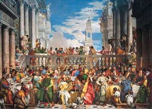 وكانت صورة الزواج في كانا (المحفوظة في متحف اللوفر) هي ذات المنظر الذي يحب فيرونيزي أن يصوره: وقد جعل خلفية الصورة مباني رومانية، وجعل في مقدمتها كلباً أو كلبين، ومائة شخص في نحو مائة موقف مختلف، وقد رسمهم كلهم كأنه يريد أن يجعل كل واحد منهم صورة كبرى قائمة بذاتها، وكان من بينهم صور تيشيان، وتنتورتو، وبسانو، وصورته هو نفسه. ومع كل منهم آلة موسيقية وترية يعزف عليها. وكان باولو يختلف عن نتورتو في أنه لم يكن يعنى أقل عناية بالواقعة؛ فهو لم يجعل في صورته المحتفلين رجالا ونساء ممن قد تحتويهم بلدة يهودية صغيرة، بل جعل المضيف من اصحاب الملايين البنادقة، وجعل له قصراً خليقاً بأن يكون قدر الإمبراطور أغسطس، فيه الضيوف والكلاب المعروفة السلالة والنسب، واحتوت الموائد ما لذ وطاب من الطعام والشراب. وإذا جاز للإنسان أن يحكم على المسيح من صور فيرونيزي، قال إنه قد استمتع بولائم كثيرة بين محنه؛ فنحن نشاهده في اللوفر يتغذى في بيت سمعان الفريسي، ومجدلية تغسل قدمه، ومن حوله نساء حسان يتحركن بين العمد الكورنثية؛ وفي توريز يتعشى في بيت سمعان الأبرص؛ وفي معرض البندقية يتغذى في بيت لاوي. لكننا نرى المسيح في معرض صور فيرونيزي يغشى عليه تحت ثقل الصليب (درسدن)، ونراه يصلب في جو مكفهر وأبراج أورشليم قائمة من تحته عن بعد (اللوفر). ولا يفصح فيرونيز عن خاتمة المأساة: فنحن نرى في أموس حجاجاً سذجاً يتعشون مع المسيح ومعهم أطفال ظراف يدللون كلباً يظهر دائماً في صور الفنان.