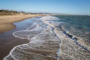 Ventura is within a seismically active region like much of California and is crossed by several potentially active fault systems.[41] The Ventura Fault is capable of an 8.0 earthquake and a local tsunami up to 23 feet in height.[42][43][44] According to the United States Census Bureau, Ventura has a total area of 32.1 ميل مربع (83 km2), of which 21.7 ميل مربع (56 km2) is land and 10.4 ميل مربع (27 km2), comprising 32.53%, is water.