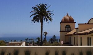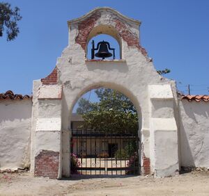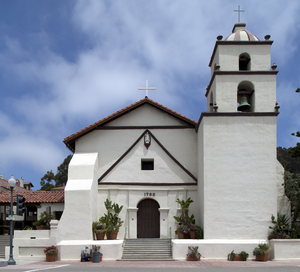 In 1769, the Spanish Portolà expedition, first recorded European visitors to inland areas of California, came down the Santa Clara River Valley from the previous night's encampment near today's Saticoy and camped near the outlet of the Ventura River on August 14. Fray Juan Crespi, a Franciscan missionary traveling with the expedition, noted that "we saw a regular town, the most populous and best laid-out of all that we had seen on the journey up to the present time."[19] Archaeological records found that the Chumash village they encountered was settled sometime around AD 1000. Junípero Serra, first leader of the Franciscans in California, founded Mission San Buenaventura in 1782 as his ninth and last mission established near the Chumash village as part of Spain's colonization of Alta California.[20] The mission was named for St. Bonaventure, a 13th-century Franciscan saint and a Doctor of the Church. San Miguel Chapel was the first outpost and center of operations while the first Mission San Buenaventura was being constructed. The first mission burned in 1801 and a replacement building of brick and stone was completed in 1809. The bell tower and facade of the new mission was destroyed by an 1812 earthquake.[21][22] The Mission was rebuilt and functions as a parish church.