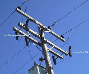 A set of pole-top fusible cutouts with one fuse blown, ليحمى محول- الأنبوب الأبيض إلى اليسار مدلى لأسفل