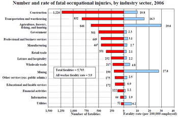 Number and rate of fatal occupational injuries, by industry sector, 2006 in the United States.[4] Selected occupations with high fatality rates, 2006, in the United States.[4] |