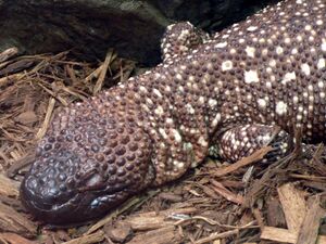 - This family includes large and stocky lizards, including the infamous Gila monster (Heloderma suspectum), which reaches a total length up to 60 cm (23.6 in) with a snout-vent length (SVL) of 36 cm (14.1 in)[7] and a body mass from 1 kg (2.2 lb)[7] to 2.2 kg (4.9 lb)[بحاجة لمصدر] depending on the source. But despite the stocky and massive body of this lizard, it is not the largest representative of the family. Greatly exceeding it in size are the Mexican beaded lizard (Heloderma horridum) and Rio Fuerte beaded lizard (Heloderma exasperatum), with a total length of up to 91 cm (36 in),[7][91] a SVL of up to 47 cm (18.5 in)[7] and a mass from 2 kg (4.4 lb)[7] to 4 kg (8.8 lb)[92][93][91] depending on the source.