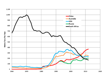 قائمة البلدان حسب انتاج الذهب من تقرير على الموقع الإلكتروني للمسح الجيولوجي الأمريكي [1].[1]