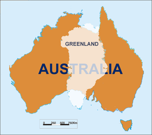 مقارنة بين حجم أصغر قارة (أستراليا) وأكبر جزيرة (گرينلاند). جنوب أستراليا توجد جزيرة تسمانيا، وترتيبها 26 من حيث المساحة.