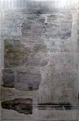 It was first described by James Burton in 1825.[1] In 1843, a German expedition directed by egyptologist Karl Richard Lepsius was traveling up the River Nile to Karnak. A French adventurer, Émile Prisse d'Avennes, dismantled and "stole" the blocks containing the king list one night in order to secure it for France, and sent it home.[2][3] Severely damaged, it is now on display at the Louvre[4] in Paris.