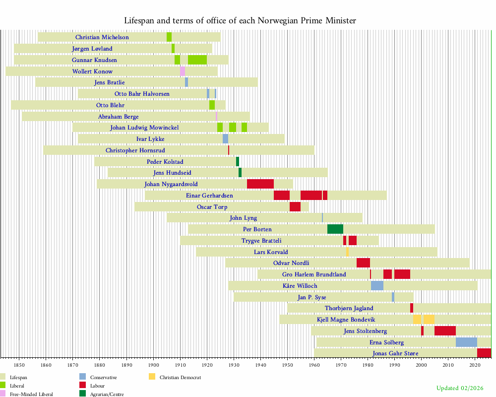 14 October 2021 | Incumbent | 4 years, 121 days | Labour Party | 2021 | Støre I Ap–Sp | |||