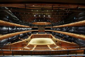 A concert hall is a cultural building with a stage that serves as a performance venue and an auditorium filled with seats.
