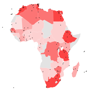 - تتجاهل القائمة التالية التعريف الجيوسياسي لأفريقيا، وتشمل ما تصفه بأنه المواقع في "الدول العربية". [24] وأدرجت مصر كجزء من شمال أفريقيا. كما تضم القائمة أيضا عددا من المواقع التي توجد في القارة الإفريقية تابعة لدول خارج القارة . وتقع أربعة مواقع من هذا القبيل في كل من :