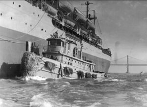 Red Cloud (foreground), a type V2-ME-A1 tug, alongside USNS David C. Shanks, at the Golden Gate at San Francisco, California, 1950s. On the bow is a tugboat fender, also call beards or bow pudding, which are rope padding to protect the bow.
