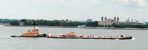 زورق السحب Matthew Tibbets في ميناء نيويورك، وتبدو جزيرة إليس في الخلفية.