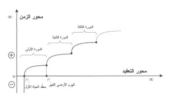 ويمكن الملاحظة أنّ هذا المنحني يمثّل الدورة الأولى من ساعة التطوّر وذلك قبل البدء بمرحلة البقاء للأكثر تنظيماً. ولكن يمكن افتراض أنّ هذه المرحلة ستكون قريبة الحصول، في غضون 50 عاماً بعد تطبيق المجتمع المثالي، مما سيسمح بالتنبؤ بسير الخط البياني للتطوّر أثناء الدورة الثانية لساعة التطوّر. بعد ذلك وباعتبار أنّ الكائنات التي سيصل إليها التطوّر في نهاية الدورة الثانية ستكون قد وصلت إلى قدرات هائلة وإمكانيّات كبيرة تفتح أمامها مجالاً لدورة ثالثة في التطوّر، فيمكن تصور استمرارية هذا الخط البياني في تلك الدورة بمنحنى ثالث شبيه بالمنحنيين الأوليين، وذلك في التصوّر البعيد جداً لقوانين التطوّر في دورتها الثالثة مما يظهر أنّ هذا الخط البياني سيكرّر نفس هذا المنحني عند كلّ دورة، والاحتمال الأكبر هو أن تكون كلّ المنحنيات متساوية القياس ومتشابهة تقريباً من حيث مجالها على محوري الزمن والتعقيد ليستمرّ هذا الخط البياني بانحناءة إضافية تعبيراً عن كلّ دورة جديدة في ساعة التطوّر ليبدو كما في (الشكل 4)