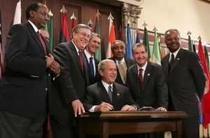 الرئيس جورج و. بوش يوقع على تشريع النمو والفرص الأفريقية ليصبح قانوناً (AGOA) في 2004 في مبنى دوايت أيزنهاور للمكتب التنفيذي في يوم الثلاثاء 13 يوليو 2004.