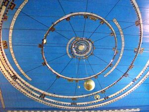 The ancient Greek polymath Archimedes is attributed with creating a primitive planetarium device that could predict the movements of the Sun and the Moon and the planets.[بحاجة لمصدر] The discovery of the Antikythera mechanism proved that such devices already existed during antiquity, though likely after Archimedes' lifetime. Campanus of Novara described a planetary equatorium in his Theorica Planetarum, and included instructions on how to build one. The Globe of Gottorf built around 1650 had constellations painted on the inside.[6] These devices would today usually be referred to as orreries (named for the Earl of Orrery). In fact, many planetariums today have projection orreries, which project onto the dome the Solar System (including the Sun and planets up to Saturn) in their regular orbital paths.