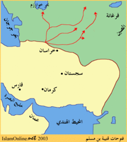 قتيبة بن مسلم (48 هـ - 96 هـ/715م) قائد عربى مشهور من اهل العراق فتح خوارزم وبخارى، وسمرقند، قتل سنة 96 هـ. ولد سنة 48 هـ في بيت إمرة وقيادة بأرض نجد، وكان أبوه 'مسلم بن عمرو' من أصحاب 'مصعب بن الزبير' والى العراق من قبل أخيه أميرالمؤمنين عبد الله بن الزبير، وقتل معه في حربه ضد عبد الملك بن مروان سنة 72 هجرية. ولما ترعرع قتيبة تعلم العلم والفقه والقرآن. ثم تعلم الفروسية وفنون الحرب، فظهر فيه النبوغ وهو شاب في مقتبل شبابه، وكانت منطقة العراق مشهورة بكثرة الفتن والثورات، لذلك عمل كل ولاة العراق على شغل أهلها بالغزوات لاستغلال طاقاتهم الثورية في خدمة الإسلام ونشر الدعوة، لذلك كانت أرض العراق هى قاعدة الانطلاق للحملات الحربية على الجبهة الشرقية للدولة الإسلامية، وقد اشترك قتيبة في هذه الحملات منذ شبابه المبكر، وأبدى شجاعة فائقة وموهبة قيادية فذة، لفتت إليه الأنظار خاصة من القائد العظيم المهلب بن أبى صفرة وكان خبيراً في معرفة الأبطال ومعادن الرجال فتفرس فيه أنه سيكون من أعظم أبطال الإسلام، فأوصى به لوالى العراق الشهير الحجاج بن يوسف الثقفي الذى كان يحب الأبطال والشجعان، فانتدبه لبعض المهام ليختبره بها ويعلم مدى صحة ترشيح المهلب له، وهل سيصلح للمهمة التى سيوكلها له بعد ذلك أم لا .