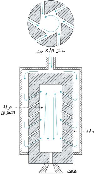 يتألف هذا النوع من المحركات من خزان وقود (كيروسين،هدراسين، هدروجين سائل) ومن خزان للمؤكسد (أوكسجين سائل أو حمض الآزوت المدخن). يتم ضخ كل من الوقود والمؤكسد من الخزانين إلى غرفة الاحتراق باستمرار خلال عمل المحرك (الشكل 3). ونتيجة لاحتراق الوقود والمؤكسد تتشكل في غرفة الاحتراق غازات مرتفعة الضغط (20ـ30 ضغط جوي) والحرارة (في حدود 1200 ºC). ويتم تمرير هذه الغازات عبر نافث متقارب ـ متباعد يتولى تحويل طاقة الضغط والطاقة الحرارية إلى طاقة حركية، حيث تخرج غازات الاحتراق وقد انخفض ضغطها إلى ما يقرب من الضغط الجوي المحيط، ودرجة حرارتها إلى نحو 600 درجة مئوية، وفي مقابل ذلك ترتفع سرعة انطلاقها إلى أضعاف سرعة الصوت. ونتيجة لخروج هذه الكمية من الغازات بهذه السرعة تتولد قوة دفع ارتكاس تدفع الصاروخ بكامله إلى الأمام. قد تكون فوهات النفث في بعض المحركات قابلة للتحريك حول المحور الطولي للصاروخ بهدف التحكم به، وغالباً ما يلجأ إلى تمرير الوقود عبر أقنية تحيط بالنافث من الخارج لتبريده من جهة ولتسخين الوقود قبل دخوله إلى غرفة الاحتراق من جهة أخرى لرفع مردود المحرك.