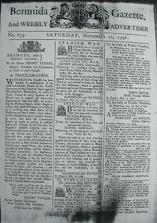 Bermuda Gazette of 12 November 1796, calling for privateering against Spain and its allies during the 1796 to 1808 Anglo-Spanish War, and with advertisements for crew for two privateer vessels.