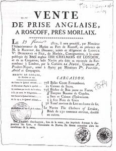Advertising for the auction of the prize Chelmers of London, brig captured by the French privateer Junon in 1810.