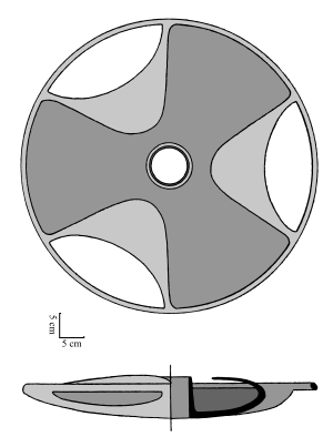 The artifact, made of الشيست (a term previously used in Egyptology for weakly metamorphic siltstone[2]), is in the shape of a shallow bowl with a diameter of 61 سنتيمتر (24 in) and a maximum height of 10.6 cm (4.2 in). There is a central hole with a diameter of about 8 cm (3.1 in), which is fitted with a socket whose height corresponds approximately to the depth of the bowl. From the slightly raised outer edge, three wings or lobes are folded inwards towards the central hole, with the outer edge remaining in the form of narrow arches that connect the non-folded parts with each other. When viewed from above, it therefore resembles a steering wheel with three very wide spokes.[3]