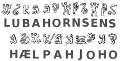 The two rows of images in the top segment of the longer horn have been taken as a cipher encoding a runic text of 22 letters, although there is no universally accepted decipherment. Hartner (1969) read luba horns ens helpa hjoho, an "apotropaic sentence" translated by Hartner as "may I, the potion of this horn, bring help to the clan".[3]