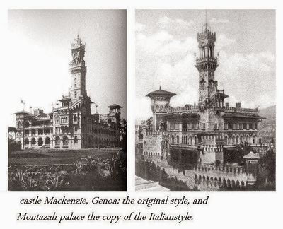 The larger Al-Haramlik Palace and royal gardens were added to the Montaza Palace grounds, being built by King Fuad I in 1932, as a summer palace. It is in a mixture of Ottoman and Florentine styles, with two towers. One of these towers rises distinctively high above with elaborated Italian Renaissance design details. The palace has long open arcades facing the sea along each floor.