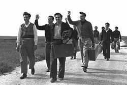 رئيس الوزراء، موشيه شاريت، ويقف خلفه مساعده جدعون رفائيل، الذي أصبح في 1954 مديرا لادارة الشرق الأوسط والأمم المتحدة بوزارة الخارجية