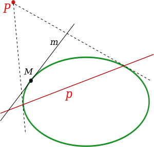 ان العلاقة التبادلية بين النقطة والخط بالنسبة لقطع مخروطي، تتلخص في انه عندما يتم إعطاء قطع مخروطي دلتا ونقطة P. كل نقطة P من المستوى يقابلها خط قطبي p والعكس صحيح. وعندما تتحرك نقطة M على طول الخط p ، يدور الخط القطبي لـ M حول القطب P للخط p. [1]