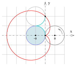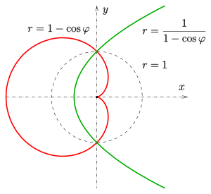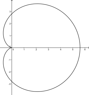 In geometry, a cardioid (من باليونانية καρδιά (kardiá)، وتعني "heart") is a plane curve traced by a point on the perimeter of a circle that is rolling around a fixed circle of the same radius. It can also be defined as an epicycloid having a single cusp. It is also a type of sinusoidal spiral, and an inverse curve of the parabola with the focus as the center of inversion.[1] A cardioid can also be defined as the set of points of reflections of a fixed point on a circle through all tangents to the circle.[2]