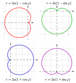 Choosing other positions of the cardioid within the coordinate system results in different equations. The picture shows the 4 most common positions of a cardioid and their polar equations.