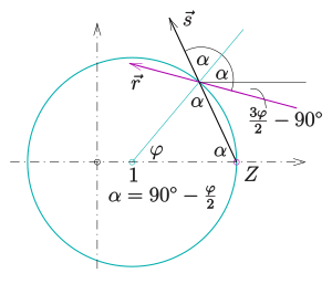 The tangent at circle point has normal vector . Hence the reflected ray has the normal vector (see graph) and contains point . The reflected ray is part of the line with equation (see previous section)