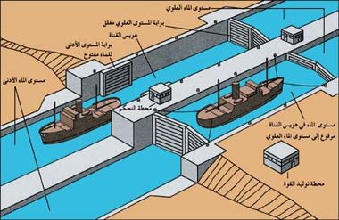 أما قناة السويس ـ التي تم إنجازها عام 1869م فتمتدّ حوالي 190كم بين بورسعيد شمال غربي مصر وبين خليج السويس الذي هو لسان بحري للبحر الأحمر وهي تسمح للسفن بالانتقال مباشرة بين البحر الأحمر والبحر الأبيض المتوسط، وتعمل رابطًا مائيًا مهمًا بين أوروبا وآسيا. فعلى سبيل المثال تختصر القناة حوالي 9,500كم من الرحلات البحرية بين الهند والمملكة المتحدة. بدون القناة تضطر السفن المتنقلة بين الدولتين إلى اجتياز الساحل الجنوبي لإفريقيا. لقد أغلقت السفن الغارقة في عام 1967م أثناء الحرب العربية الإسرائيلية قناة السويس وتعطلت الحركة بين آسيا وأوروبا. وأعادت مصر فتح القناة في عام 1975م.