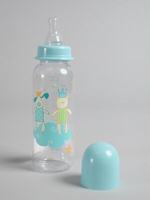 A modern, decorated, transparent plastic feeding bottle with blue cap and silicone teat, anti-leakage plate and screw mounting