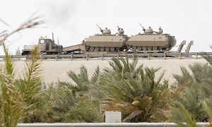 ناقلات جنود مدرعة منقولة بالقرب من جسر الملك فهد في المنامة. الجسر يربط البحرين بالسعودية. تصوير حمد محمد، رويترز، 16 مارس 2011.