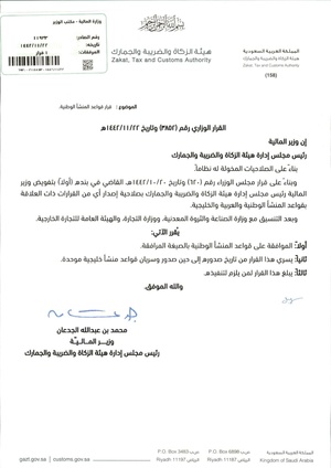 ==التاريخ في 3 يوليو 2021، وافق وزير المالية رئيس مجلس إدارة هيئة الزكاة والضريبة والجمارك في السعودية على قواعد المنشأ الوطنية السعودية المكونة من 34 مادة والتي ستساهم في دعم الصناعة الوطنية الخليجية. وأكد محمد الجدعان، وزير المالية رئيس مجلس إدارة هيئة الزكاة والضريبة والجمارك عبر حسابه في "تويتر" أن "القواعد ستساهم في تعزيز المحتوى المحلي من خلال دعم الصناعة الوطنية الخليجية وتعزيز التنمية المستدامة".[1]