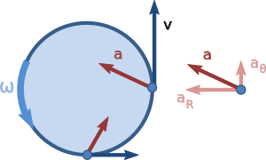 As a particular example, if the particle moves in a circle of constant radius R, then dρ/dt = 0, v = vθ, and: