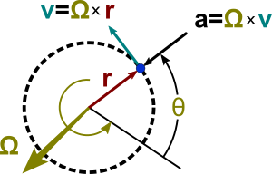 The image at right shows the vector relationships for uniform circular motion. The rotation itself is represented by the angular velocity vector Ω, which is normal to the plane of the orbit (using the right-hand rule) and has magnitude given by: