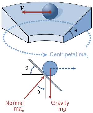 The upper panel in the image at right shows a ball in circular motion on a banked curve. The curve is banked at an angle θ from the horizontal, and the surface of the road is considered to be slippery. The objective is to find what angle the bank must have so the ball does not slide off the road.[15] Intuition tells us that, on a flat curve with no banking at all, the ball will simply slide off the road; while with a very steep banking, the ball will slide to the center unless it travels the curve rapidly.