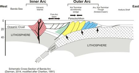 - The Outer Banda Arc consists of Australian continental margin cover units that were scrapped off the Australian plate and added to the southern edge of the Asian plate. The oldest sedimentary rocks in these islands are from the Early Permian. The Banda arc-continent collision is still active and converging at a rate of 7 cm/a. It stretches from Savu through Rote, Timor, Leti, Babar, Tanimbar, and the Kai Islands, before turning west to Seram, Ambon, and Buru. The outer arc is geologically associated with the Australian continent, though it is a more recent accretion than the neighboring Aru Islands.